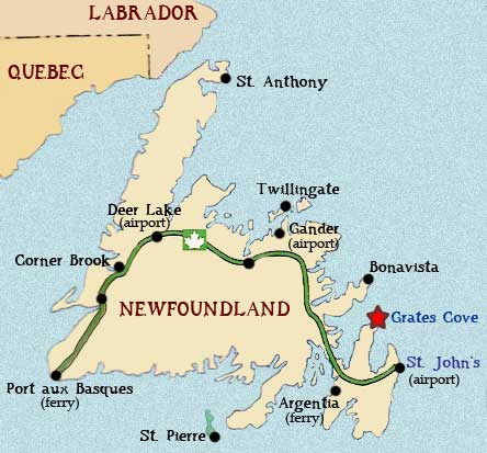 We are located in the historic village of GRATES COVE, Newfoundland, at the farthest point on the Baccalieu Trail. Our Cafe and Gift Shop is open from June to September. Starting July 2010, come join us for our live traditional Newfoundland music concerts with renowned musicians. Nearby is BACCALIEU ISLAND ECOLOGICAL RESERVE with millions of seabirds there, as well as the large numbers of whales and porpoises in our waters. If you come in the spring to early summer, you will see icebergs as they pass right by "our front door".