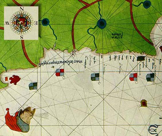 flags marking certain named places. Speculation abounds as to where this coastline is actually located, one possible scenario being the south coast of Newfoundland, which does indeed run generally east to west. This would certainly discourage the idea that Grates Cove is where Cabot landed, as it is on the east coast on the Avalon peninsula. However, others speculate this could represent coastline of the Avalon, or St. Lawrence River, or Nova Scotia, or numerous other places, as there is no clear clues to grab ahold of. Each Discovery theorist will be able to interpret the map to suit their own purposes, and make very compelling arguments. So this writer will shamelessly do the same!....